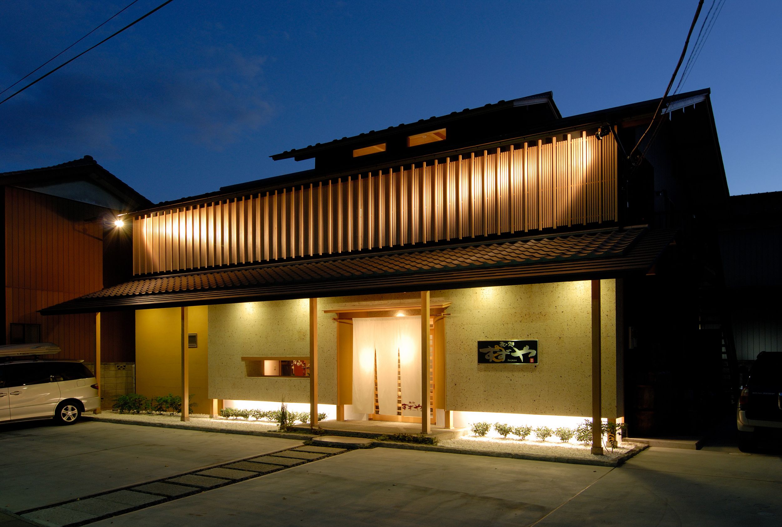 京町家をイメージした日本料理店では、店の正面に大谷石を採用。