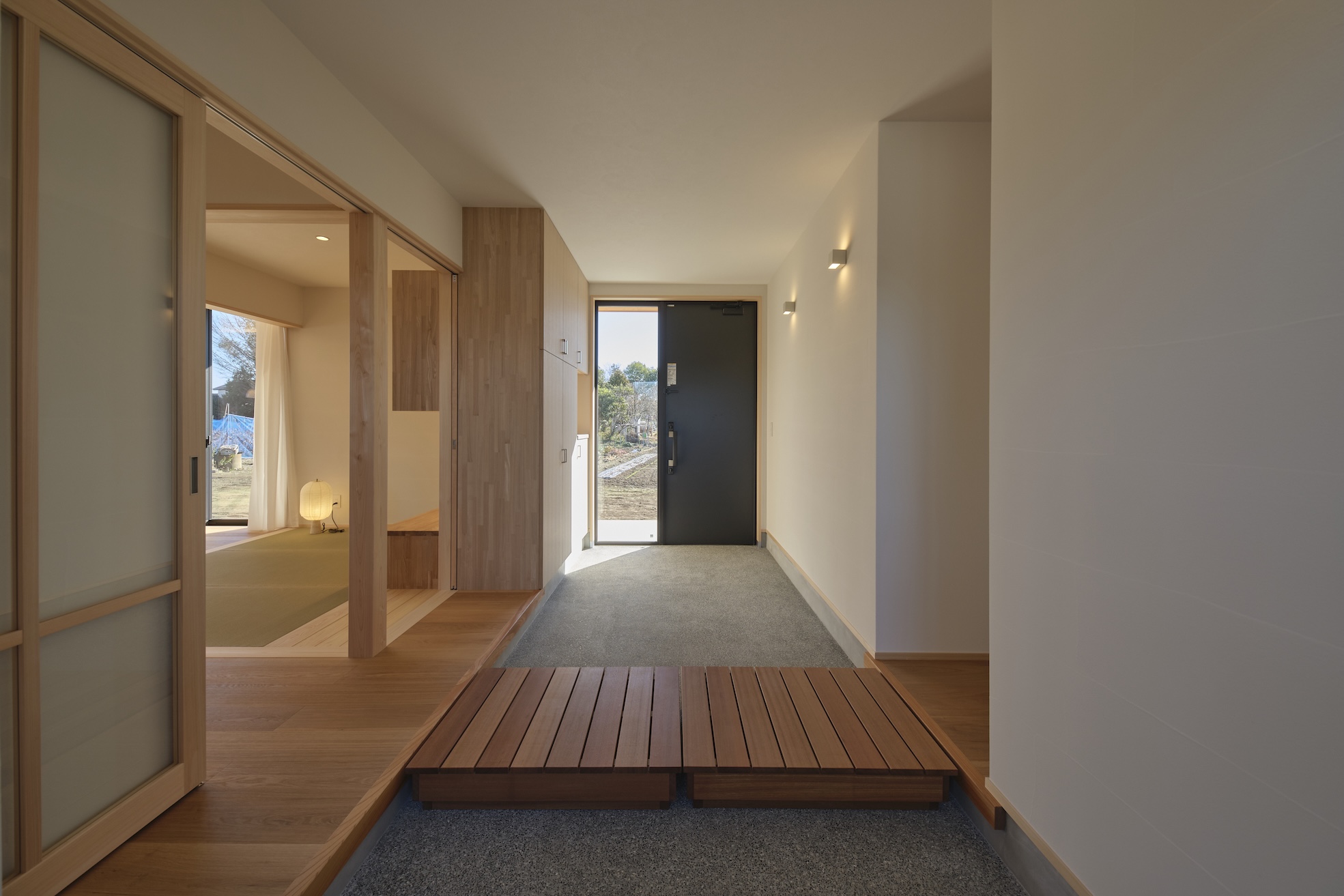 北側の通路と南の庭とをやわらかに繋ぎました。
